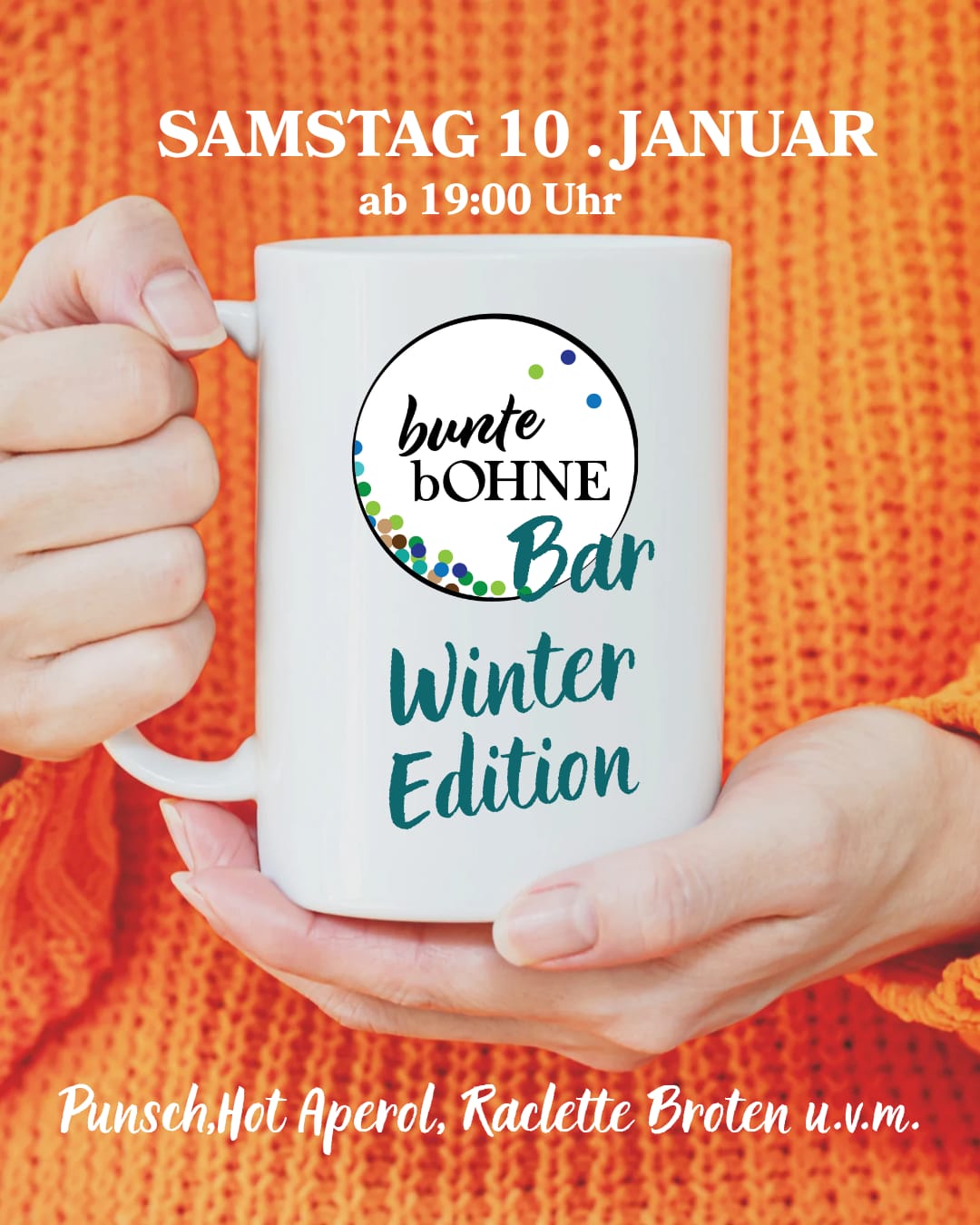 Bei den niedrigen Temperaturen starten wir 2026 mit einer winterlichen bunte bOHNE Bar: Es gibt Punsch, Hot Aperol, wärmende Suppe, Raclette-Brote, vegane Bratwurst in der Semmel!
